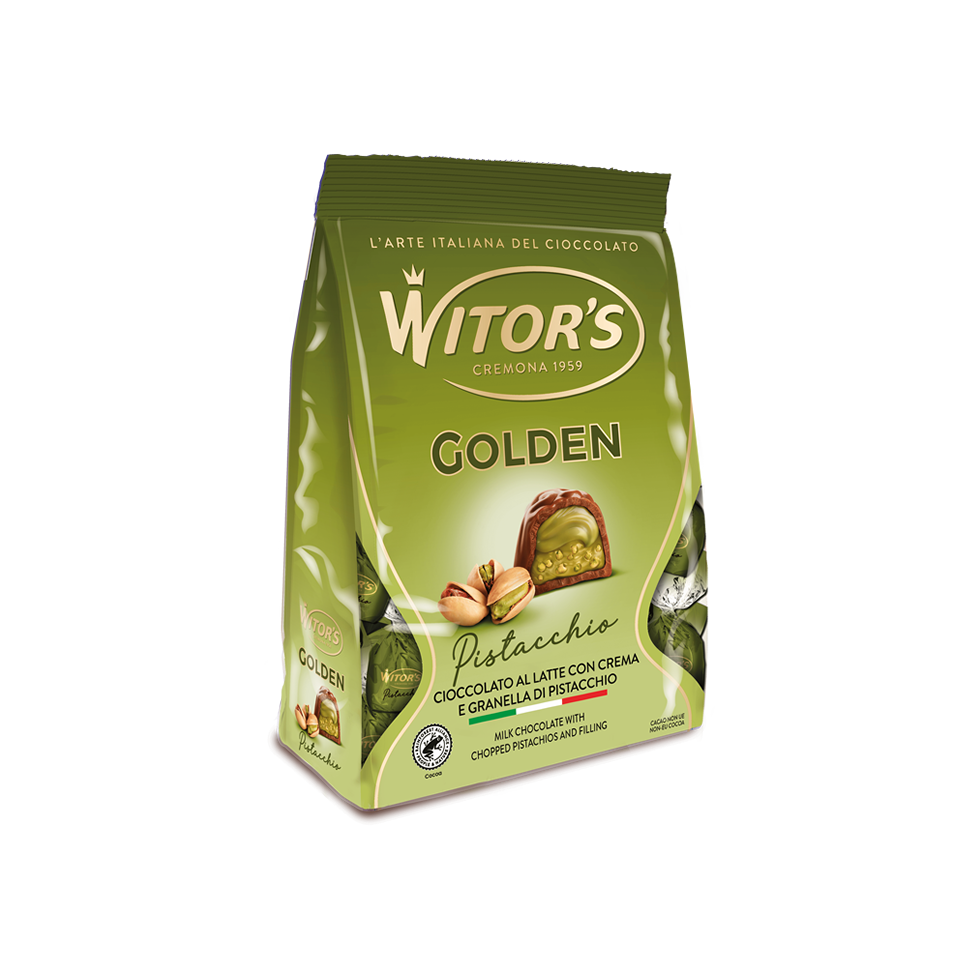 PRALINE DI CIOCCOLATO AL LATTE (cacao: 30% minimo) CON CREMOSO RIPIENO AL PISTACCHIO E GRANELLA DI PISTACCHIO. Ingredienti: zucchero, grassi vegetali (cocco, palmisti, girasole, burro di cacao), pasta di cacao, latte intero in polvere, siero di latte in polvere, pistacchio (6,5%), burro di cacao, lattosio, latte scremato in polvere, emulsionante: lecitina di soia, aromi, sale. Può contenere tracce di altra frutta a guscio, uova e glutine.