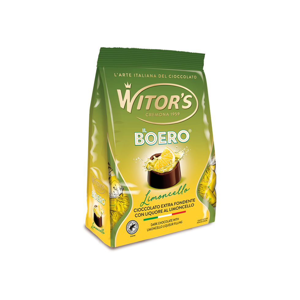 PRALINE DI CIOCCOLATO EXTRA FONDENTE (cacao: 45% minimo) CON CREMOSO RIPIENO AL LIMONCELLO. Ingredienti: zucchero, pasta di cacao*, sciroppo di glucosio, acqua, burro di cacao*, liquore limoncello 2,5% (alcool, zucchero, acqua, scorza di limone, aromi), alcool, burro vaccino anidro, emulsionante: lecitina di soia, aromi, estratto vegetale colorante: cartamo. Può contenere tracce di frutta a guscio, uova e glutine. Cacao non UE. * Rainforest Alliance Certified.ra.org.