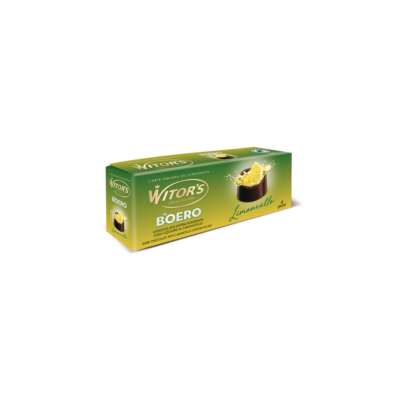 PRALINE DI CIOCCOLATO EXTRA FONDENTE (cacao: 45% minimo) CON CREMOSO RIPIENO AL LIMONCELLO. Ingredienti: zucchero, pasta di cacao*, sciroppo di glucosio, acqua, burro di cacao*, liquore limoncello 2,5% (alcool, zucchero, acqua, scorza di limone, aromi), alcool, burro vaccino anidro, emulsionante: lecitina di soia, aromi, estratto vegetale colorante: cartamo. Può contenere tracce di frutta a guscio, uova e glutine. Cacao non UE. * Rainforest Alliance Certified.ra.org.