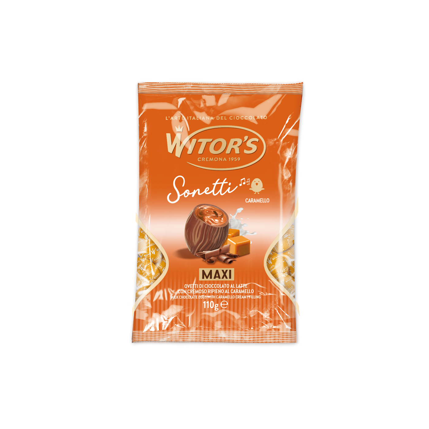 PRALINE DI CIOCCOLATO AL LATTE (cacao: 30% minimo) CON CREMOSO RIPIENO AL GUSTO CARAMELLO. Ingredienti: zucchero, grassi vegetali (cocco, palmisti), latte scremato in polvere, pasta di cacao, latte intero in polvere, burro di cacao, lattosio, siero di latte in polvere, cacao magro in polvere, zucchero caramellizzato (1%), emulsionante: lecitina di soia, aromi, colorante: estratto di paprica. CACAO NON UE. Può contenere tracce di frutta a guscio, uova e glutine.