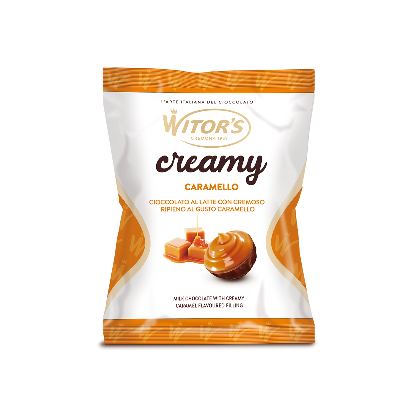 PRALINE DI CIOCCOLATO AL LATTE (cacao: 30% minimo) CON CREMOSO RIPIENO AL GUSTO CARAMELLO. Ingredienti: zucchero, grassi vegetali (cocco, palmisti), latte scremato in polvere, pasta di cacao, burro di cacao, latte intero in polvere, lattosio, siero di latte in polvere, cacao magro in polvere, zucchero caramellizzato (1%), emulsionante: lecitina di soia, aromi, colorante: estratto naturale di paprica. Può contenere tracce di frutta a guscio, uova e glutine.