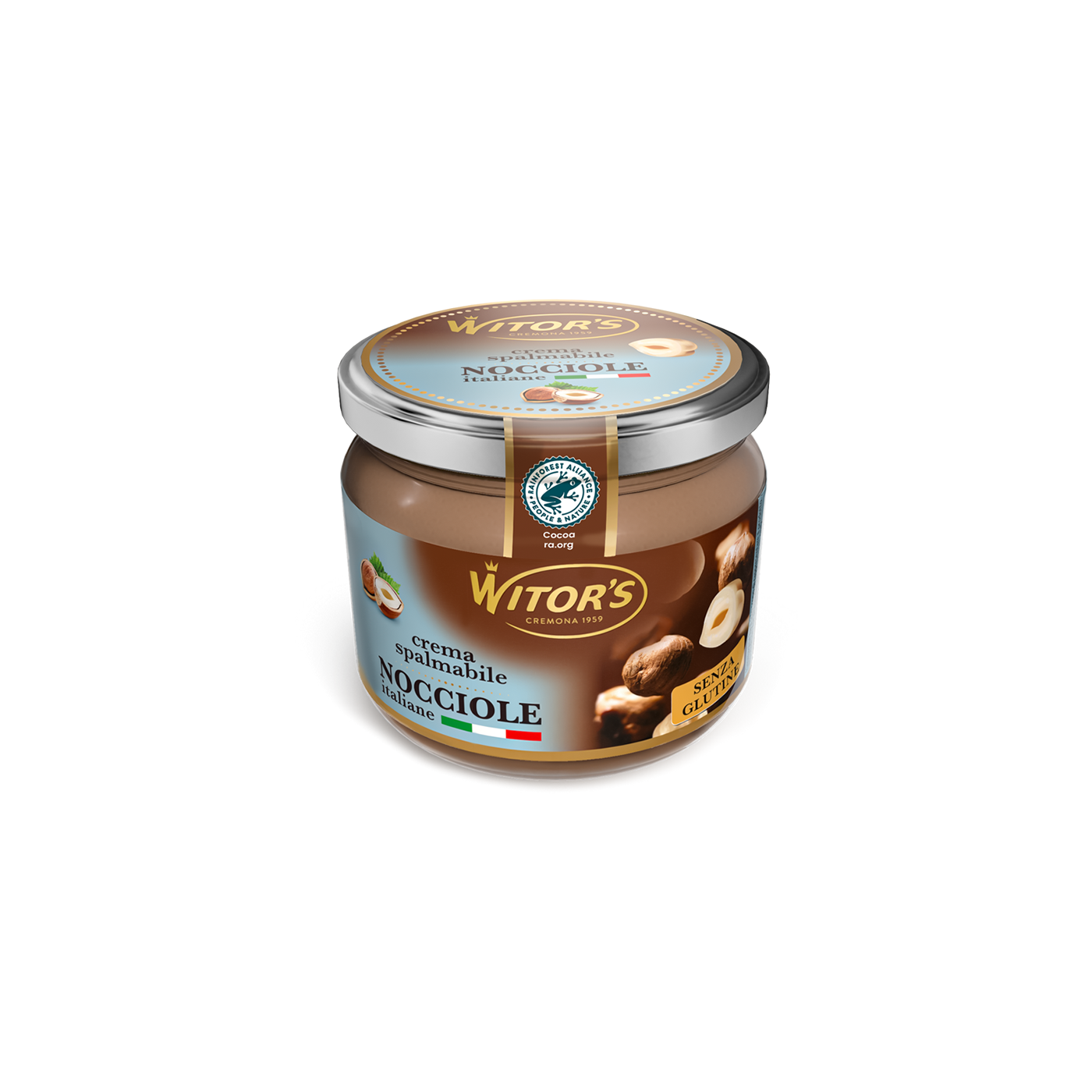 CREMA SPALMABILE ALLE NOCCIOLE. Ingredienti: zucchero, grassi vegetali (girasole, burro di cacao*), nocciole (16%), latte scremato in polvere, siero di latte in polvere, lattosio, emulsionante: lecitina di soia, aromi. Può contenere tracce di altra frutta a guscio. Senza glutine.