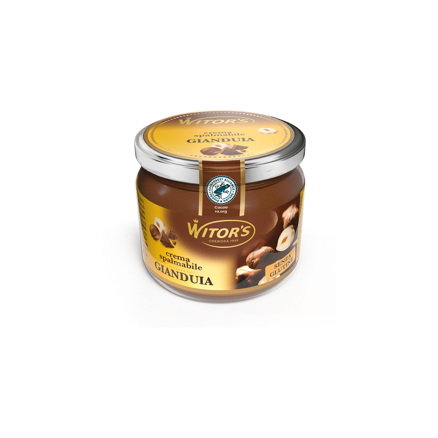 CREMA SPALMABILE CON CIOCCOLATO ALLE NOCCIOLE GIANDUIA. Ingredienti: zucchero, olio di girasole, cioccolato alle nocciole gianduia (15%) ( nocciole, zucchero, cacao magro in polvere*, burro di cacao*), latte scremato in polvere, siero di latte in polvere, nocciole, burro di cacao*, cacao magro in polvere*, emulsionante: lecitina di soia, aroma. Nocciole 10% del totale del prodotto. Può contenere tracce di altra frutta a guscio. Senza glutine.