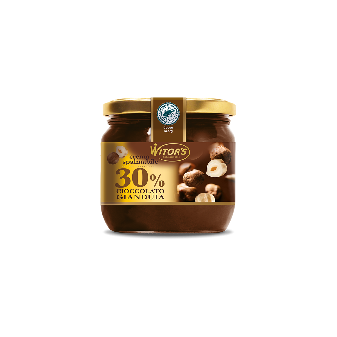 CREMA SPALMABILE CON CIOCCOLATO ALLE NOCCIOLE GIANDUIA. Ingredienti: zucchero, cioccolato alle nocciole gianduia 30% (nocciole, zucchero, cacao magro in polvere*, burro di cacao*), grassi vegetali (girasole, palma, soia - in proporzione variabile), latte scremato in polvere, siero di latte in polvere, nocciole, emulsionante: lecitina di soia, aroma. Nocciole 16% del totale prodotto. Può contenere tracce di altra frutta a guscio. Senza glutine.