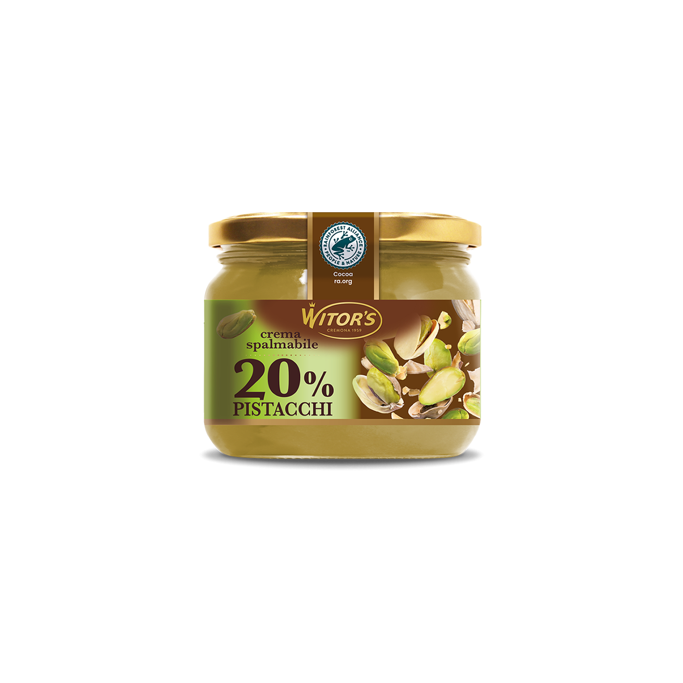CREMA SPALMABILE AL PISTACCHIO. Ingredienti: zucchero, grassi vegetali (girasole, palma, soia, burro di cacao*, - in proporzione variabile) pistacchi(20%), latte scremato in polvere, lattosio, emulsionante: lecitina di soia. Può contenere tracce di altra frutta a guscio e glutine.