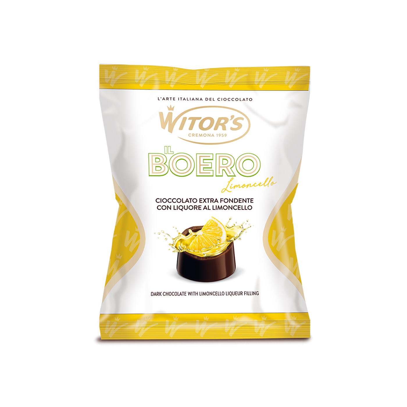 PRALINE DI CIOCCOLATO EXTRA FONDENTE (cacao: 45% minimo) CON CREMOSO RIPIENO AL LIMONCELLO. Ingredienti: zucchero, pasta di cacao, sciroppo di glucosio, acqua, burro di cacao, liquore limoncello 2,5% (alcool, zucchero, acqua, scorza limone, aromi), alcool, burro vaccino, emulsionante: lecitina di soia, aromi, estratto vegetale colorante: cartamo. Può contenere tracce di frutta a guscio, uova e glutine.