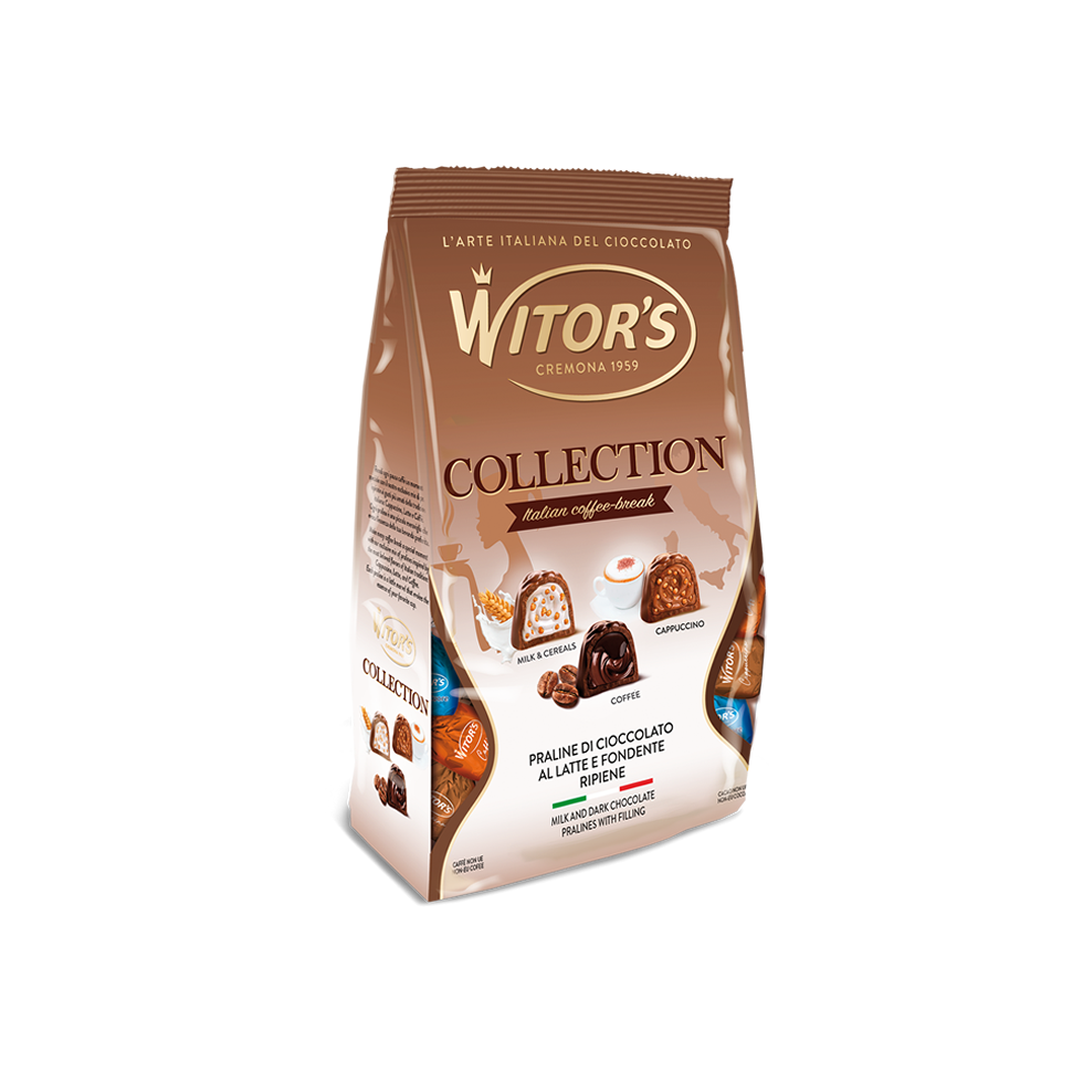 PRALINE ASSORTITE DI CIOCCOLATO AL LATTE ED EXTRA FONDENTE CON CREMOSO RIPIENO. Ingredienti: zucchero, grassi vegetali (cocco, palmisti, palma - in proporzione variabile), pasta di cacao, crema al caffè (6%) (sciroppo di glucosio, destrosio, stabilizzante: E422, zucchero, acqua, estratto di caffè 0,2%, amido modificato di mais, aroma naturale, addensante: E406, sale, conservante: E202, emulsionante: E471), latte intero in polvere, burro di cacao, cereali croccanti (3,5%) (farina di mais, farina di riso, zucchero, farina di frumento, cacao in polvere, siero di latte in polvere, sale), siero di latte in polvere, latte scremato in polvere (2%), cacao magro in polvere (1,5%), lattosio, caffè in polvere (0,3%), emulsionante: lecitina di soia, aromi. Può contenere tracce di frutta a guscio e uova.