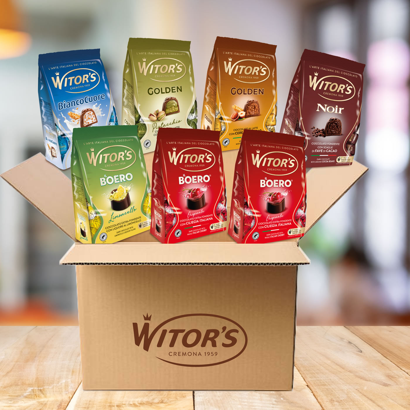 L'avvolgenza della ciliegia, la morbidezza della crema al latte, la freschezza del limoncello, la croccantezza della nocciola, l'intensità del fondente ed il gusto deciso del pistacchio: un tripudio di gusto racchiuso in un unico kit, che porterà a casa tua tutto la gioia del cioccolato Witor's, per i tuoi momenti di coccola quotidiana.
