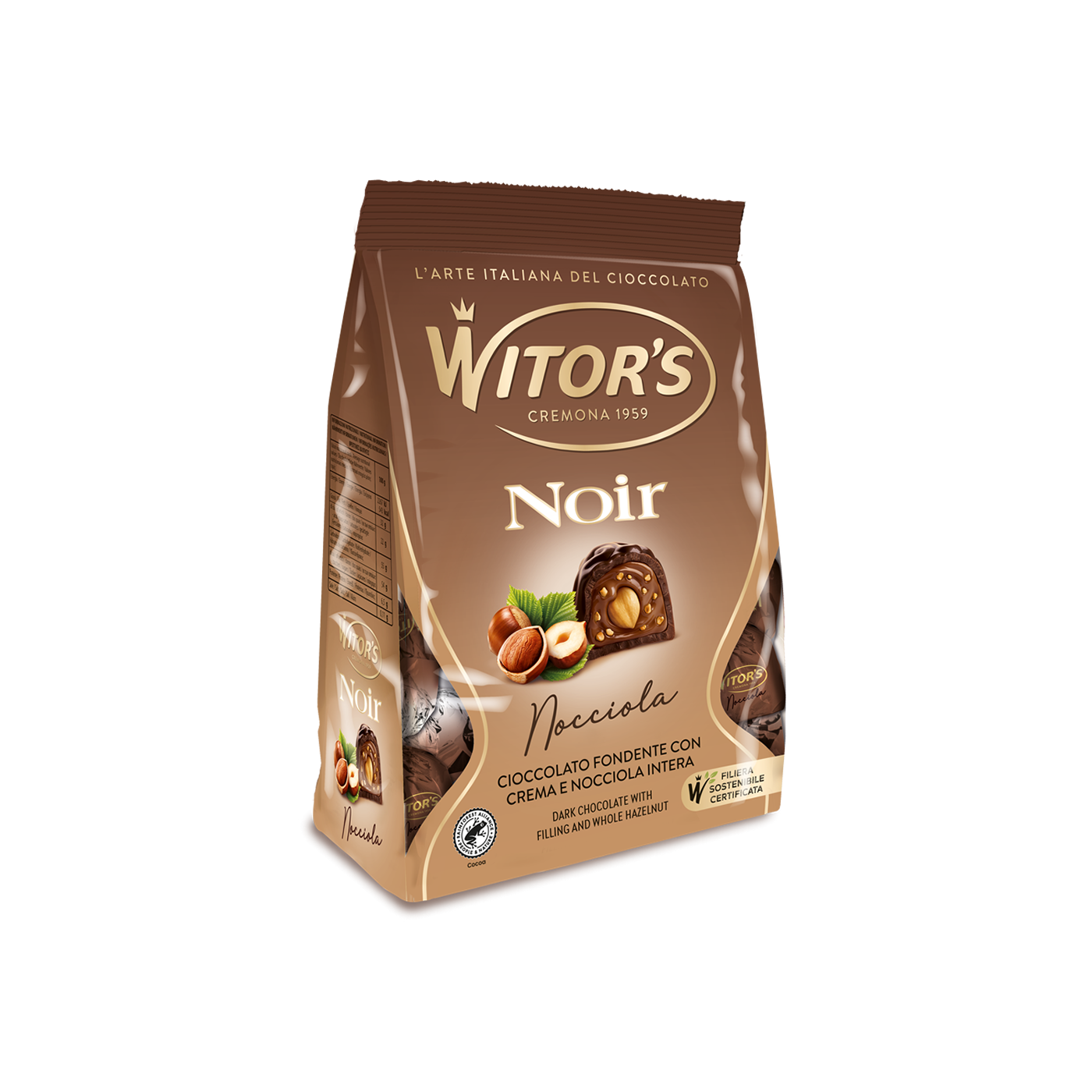 PRALINA DI CIOCCOLATO EXTRA FONDENTE (cacao: 50% minimo) RIPIENO CON NOCCIOLE. Ingredienti: zucchero, pasta di cacao, nocciole (21%), burro di cacao, latte intero in polvere, burro vaccino anidro, emulsionante: lecitina di soia, aroma. Può contenere tracce di altra frutta a guscio, uova e glutine.