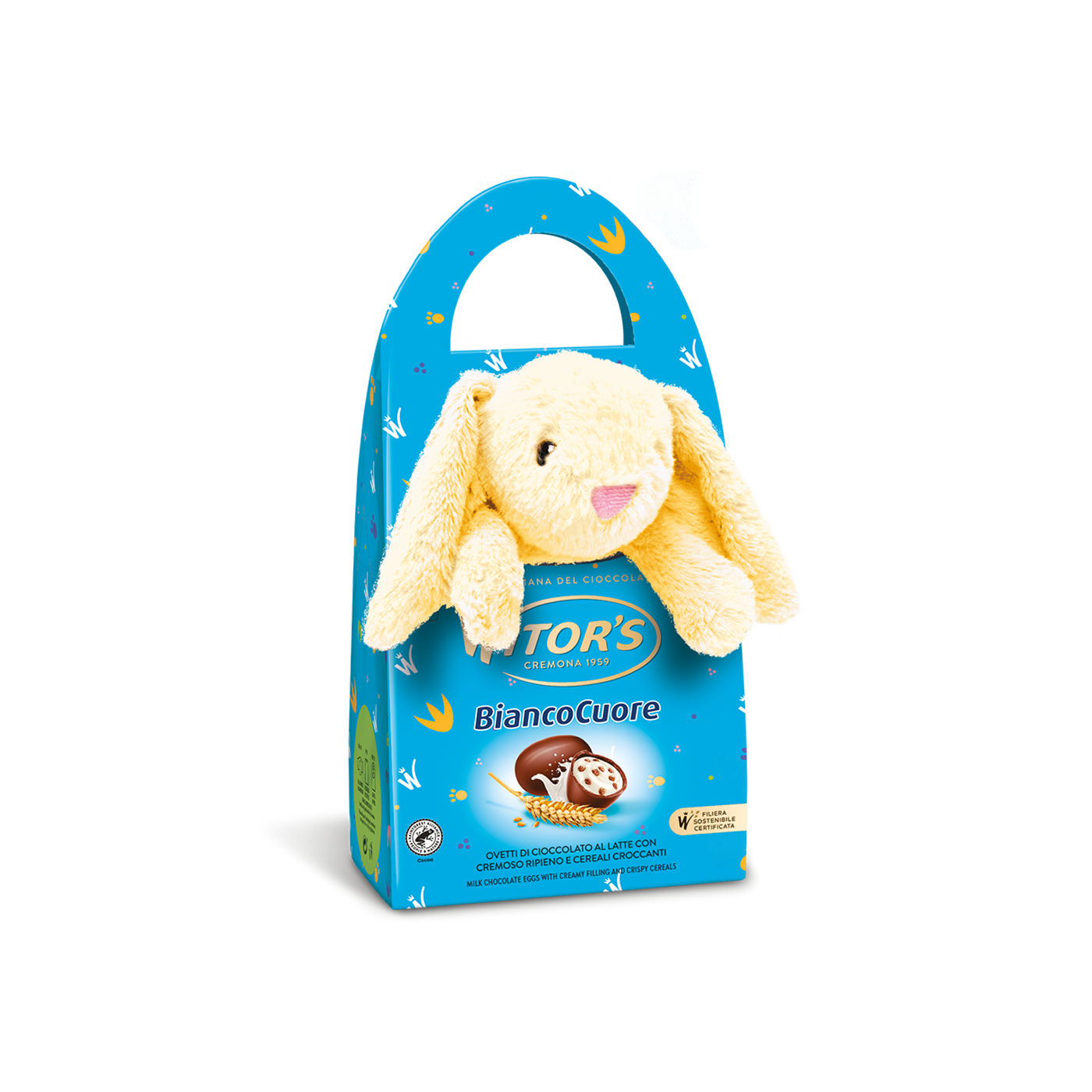 Deliziosi ovetti Bianco Cuore racchiusi in una simpatica idea regalo, accompagnata da un morbidissimo amico. Qual è il tuo preferito? Coniglietto, pecorella o papera?