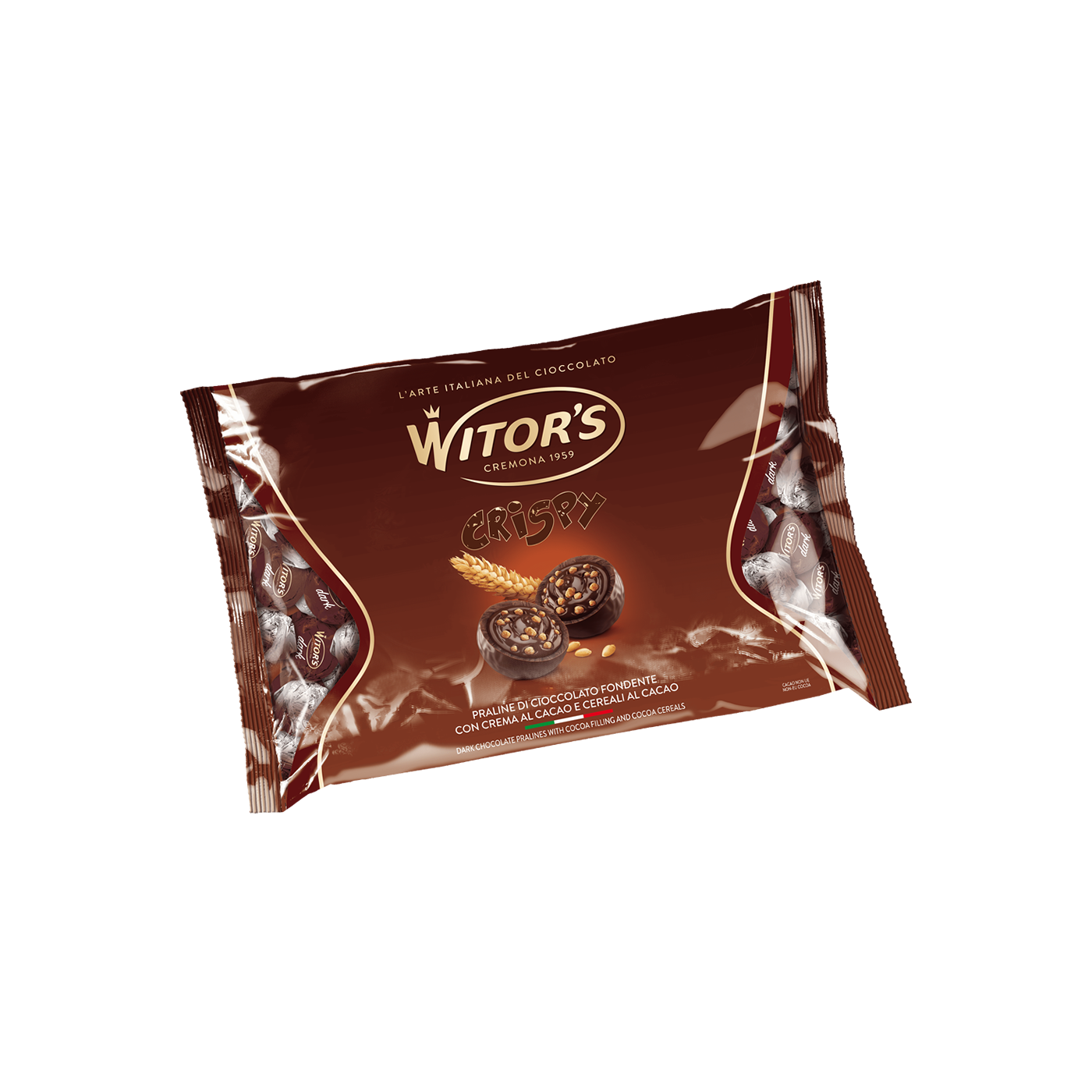 PRALINE DI CIOCCOLATO FONDENTE (cacao: 50% min.) CON CREMOSO RIPIENO AL CACAO E CEREALI CROCCANTI. Ingredienti: zucchero, grassi vegetali (cocco, palmisti, palma - in proporzioni variabili), pasta di cacao, cacao magro in polvere (5,8%), cereali croccanti (5% - farina di mais, farina di riso, zucchero, farina di frumento, cacao in polvere, siero di latte in polvere, sale), burro di cacao, burro vaccino anidro, emulsionante: lecitina di soia, aroma.