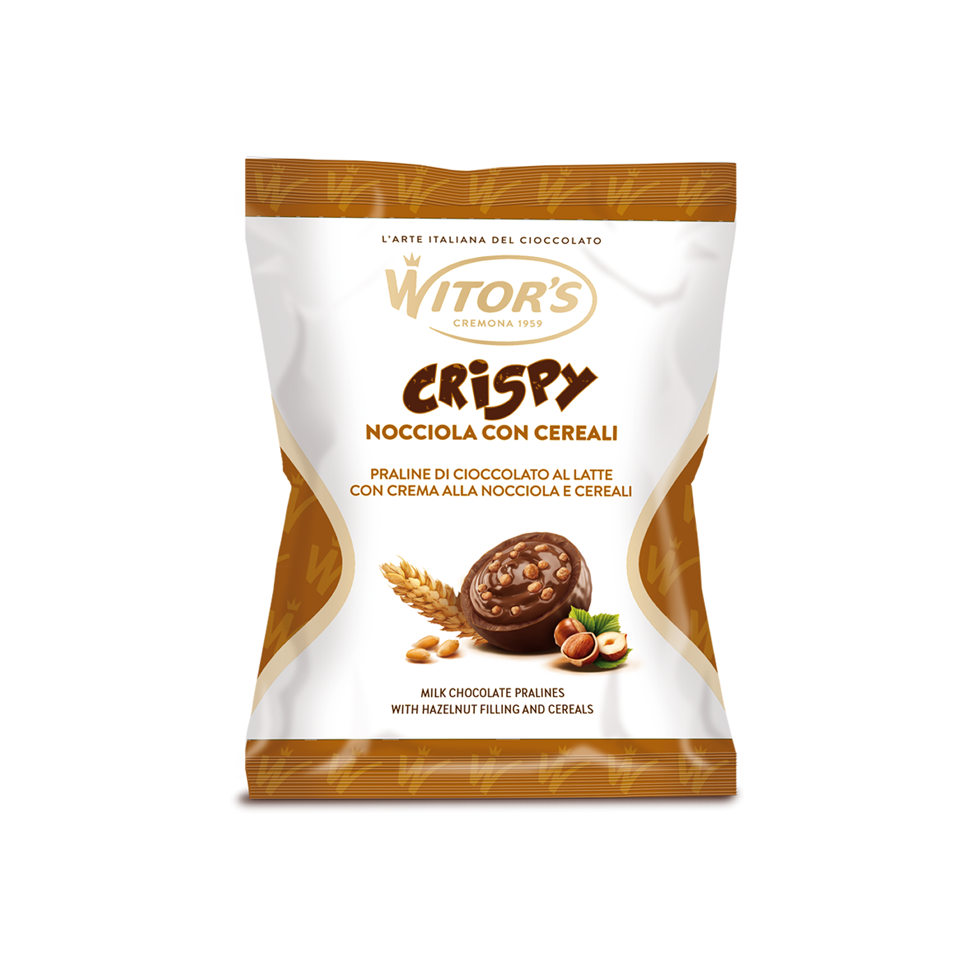 PRALINE DI CIOCCOLATO AL LATTE (cacao: 30% minimo) CON CREMOSO RIPIENO ALLA NOCCIOLA E CEREALI CROCCANTI. Ingredienti: zucchero, grassi vegetali (cocco, palmisti, palma, - in proporzione variabile), siero di latte in polvere, pasta di cacao, cereali croccanti (5%) (farina di mais, farina di riso, zucchero, farina di frumento, cacao in polvere, siero di latte in polvere, sale), burro di cacao, latte intero in polvere, nocciole (2%), cacao magro in polvere, latte scremato in polvere, emulsionante: lecitina di soia, aromi. Può contenere tracce di altra frutta a guscio e uova.