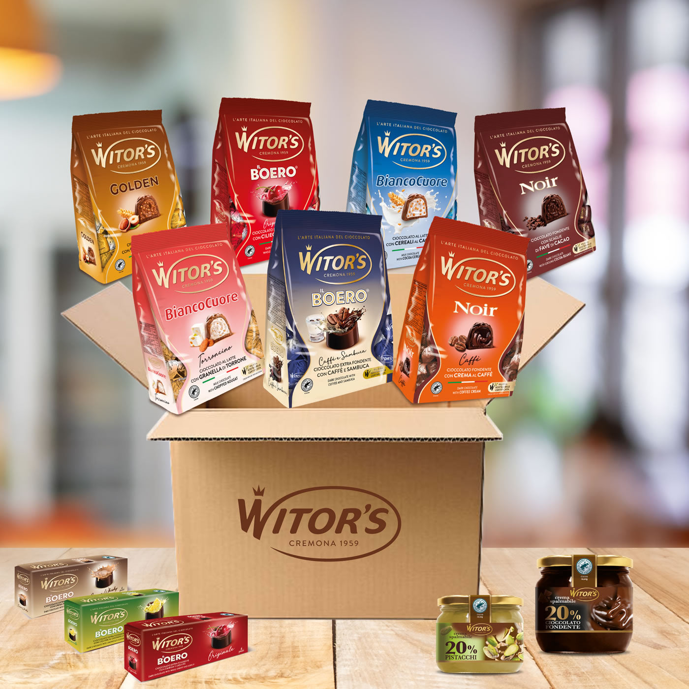 Questa box propone un'accurata e ricca selezione delle golosità Witor's, per rispondere ad ogni tuo bisogno di dolcezza. Un ampia proposta di praline, il duo di tavolette Nero Sublime e di creme spalmabili, il tris di Boero stick, i biscotti Ciokolotti e gli snack Ciokopiù. Lasciati tentare da tutta la gioia del cioccolato Witor's!